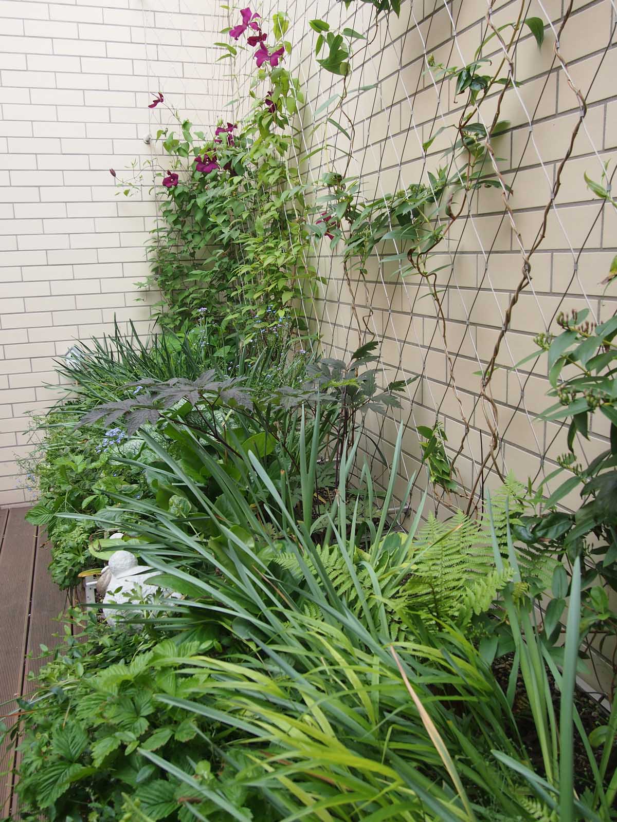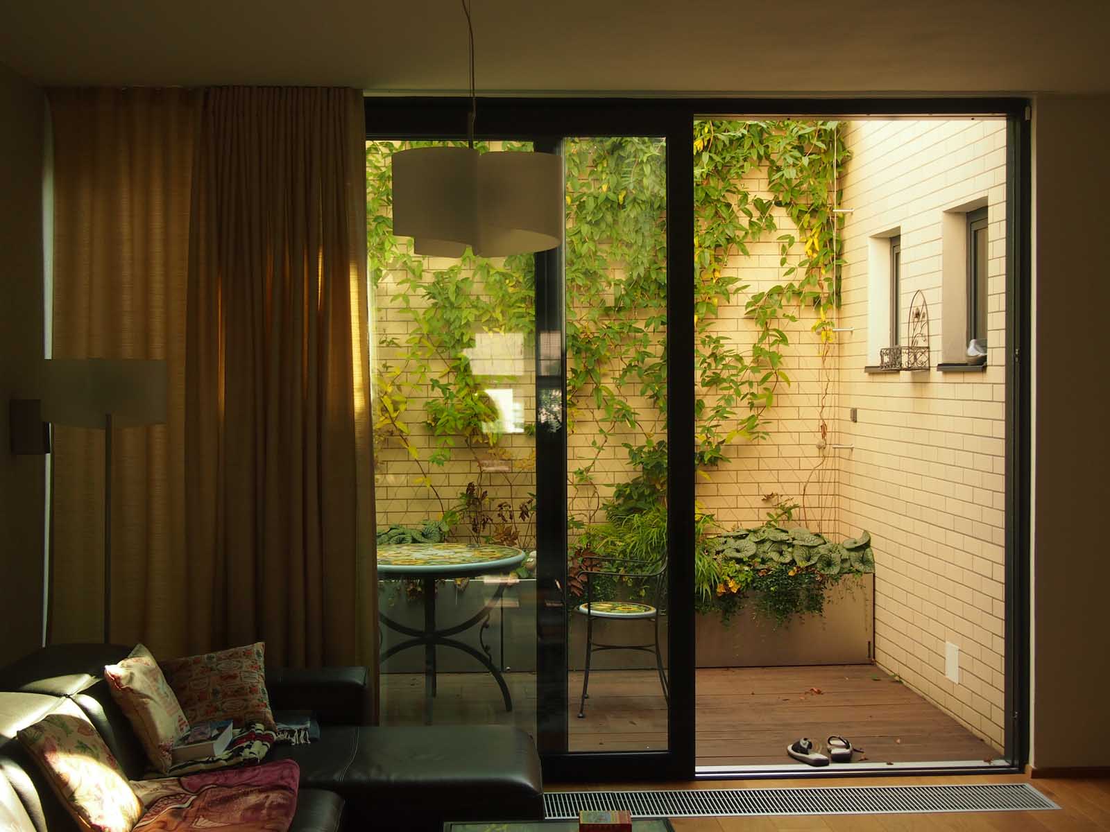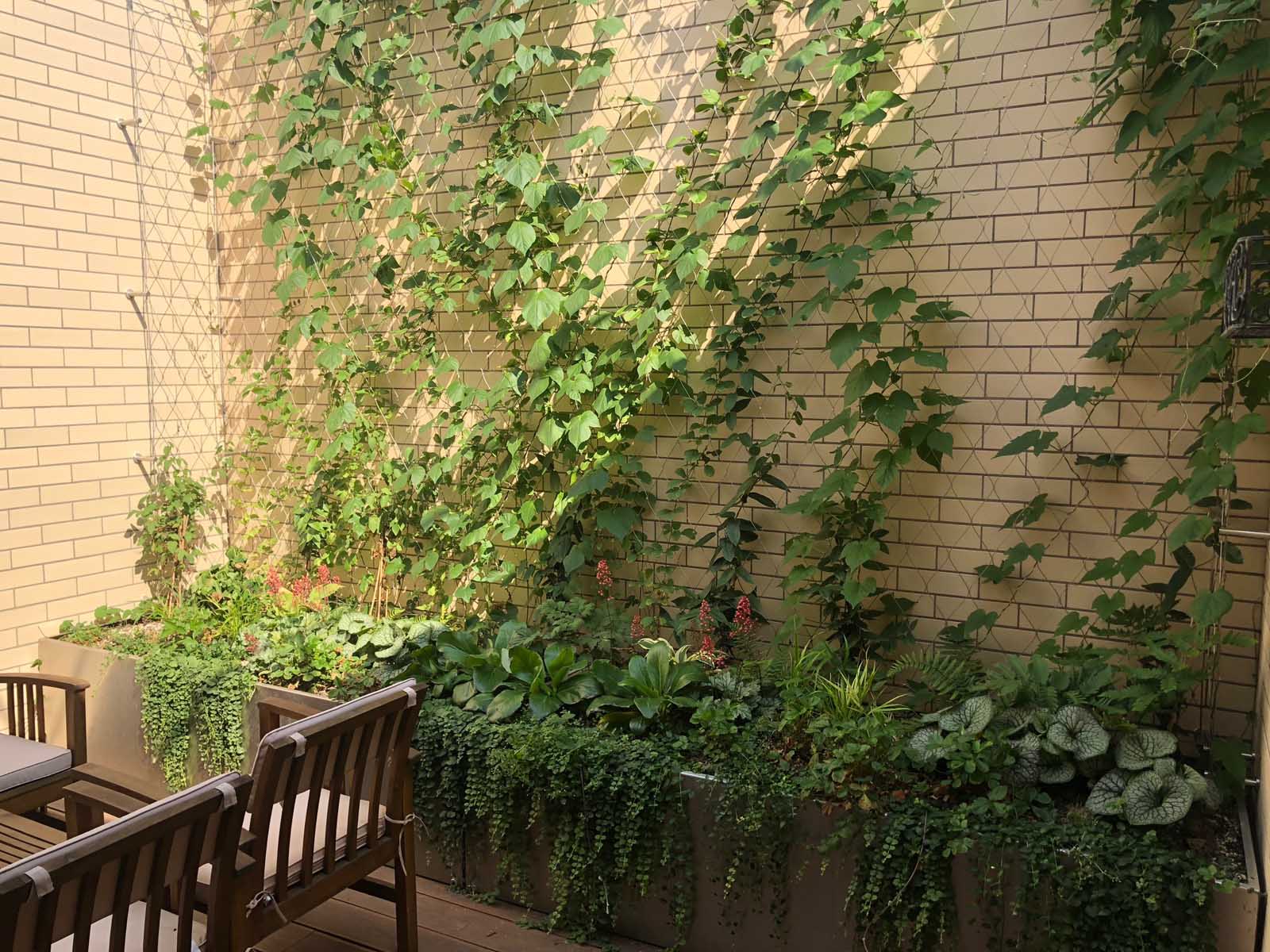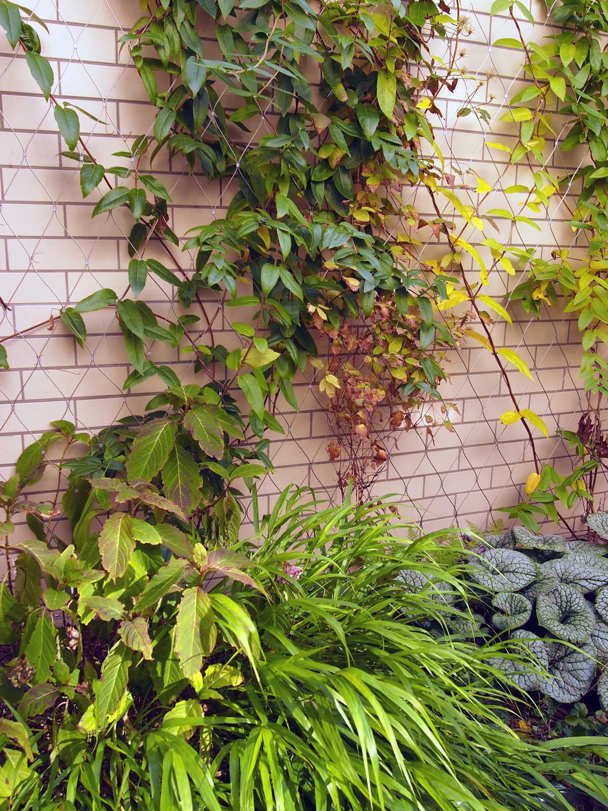 Stavebník si přál ozelenit dvorek, který navazuje přímo na obývací pokoj rodinného domku. Návrh jsme pojali koncepčně jako zelený obraz, na který se díváme z obýváku, a který se proměňuje v souladu s ročními cykly. Kombinaci trvalek, popínavých dřevin, cibulovin a letniček jsme vysadili do dvou na míru vyrobených nerezových květináčů. Do zdí dvorku je ukotvena nerezová síť sloužící jako opora pro vybrané ovíjivé rostliny.