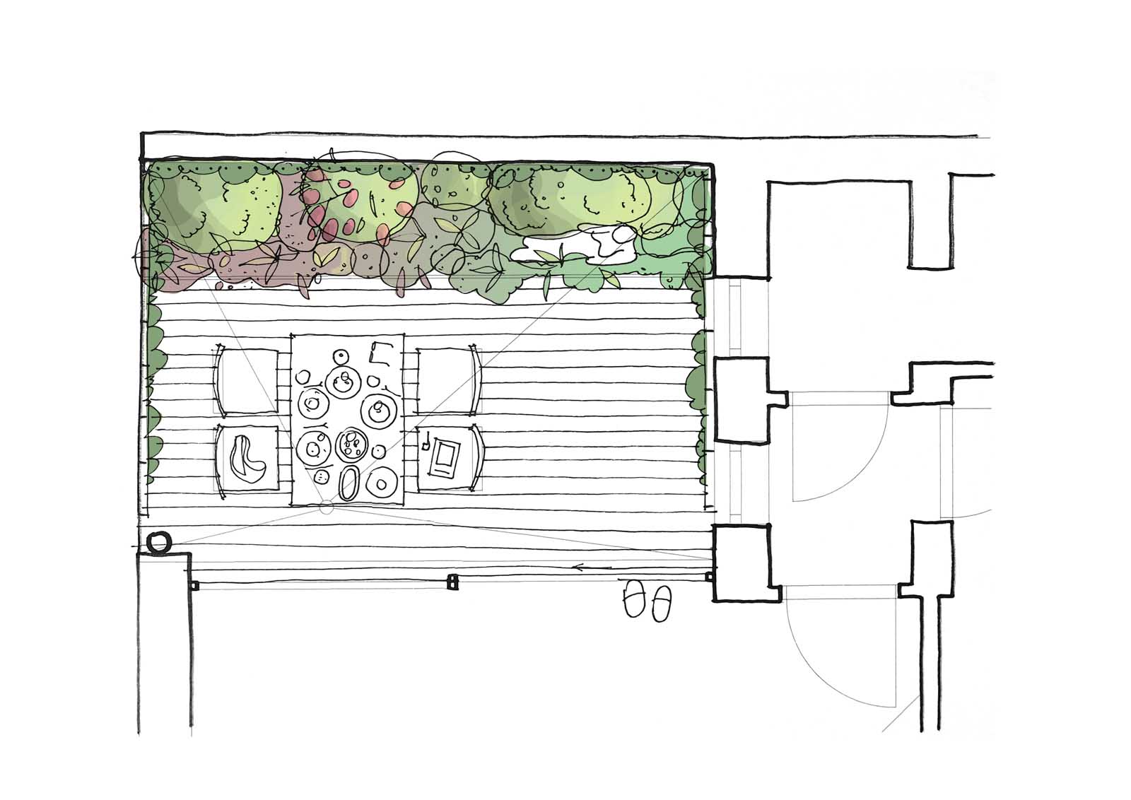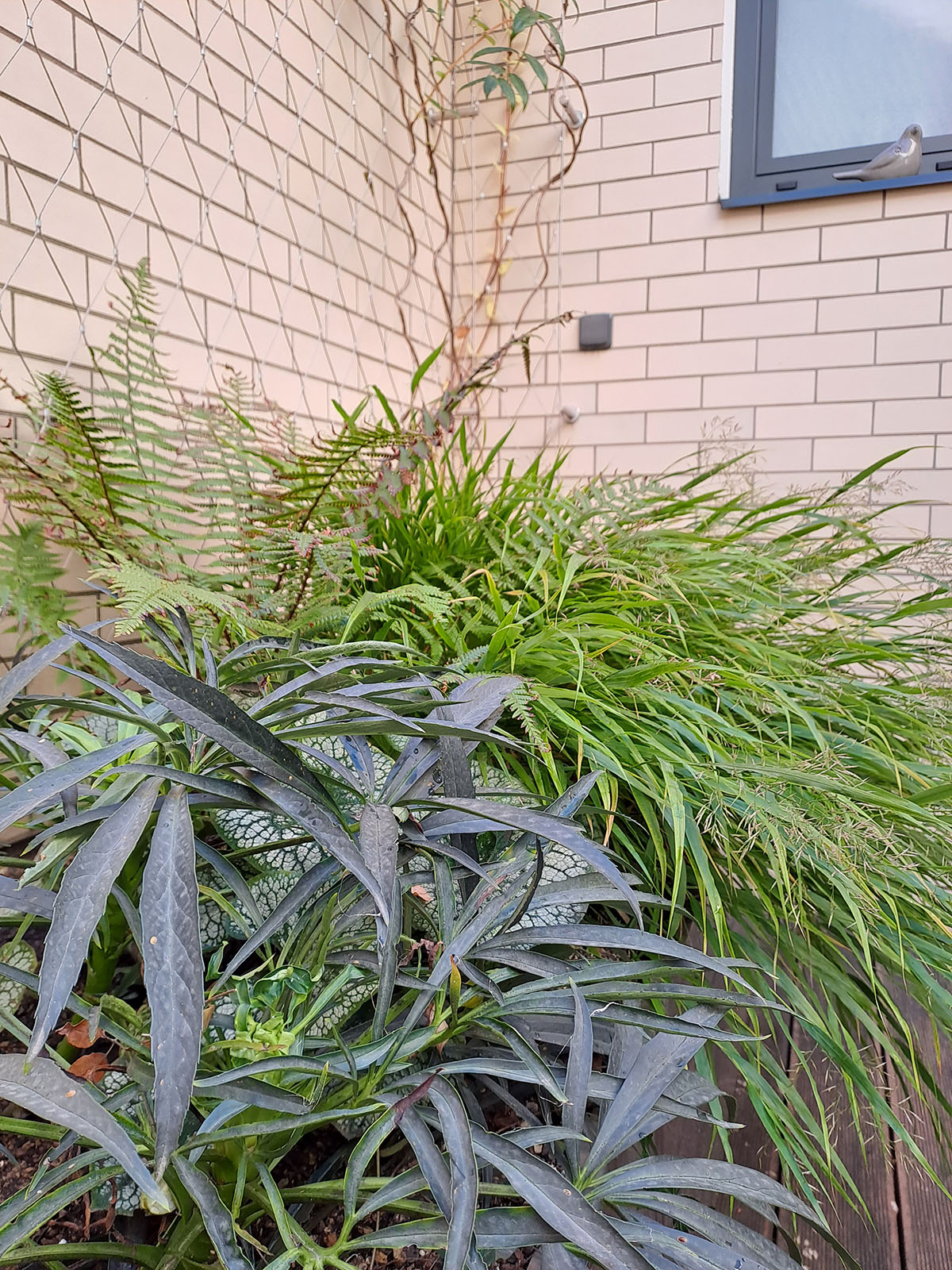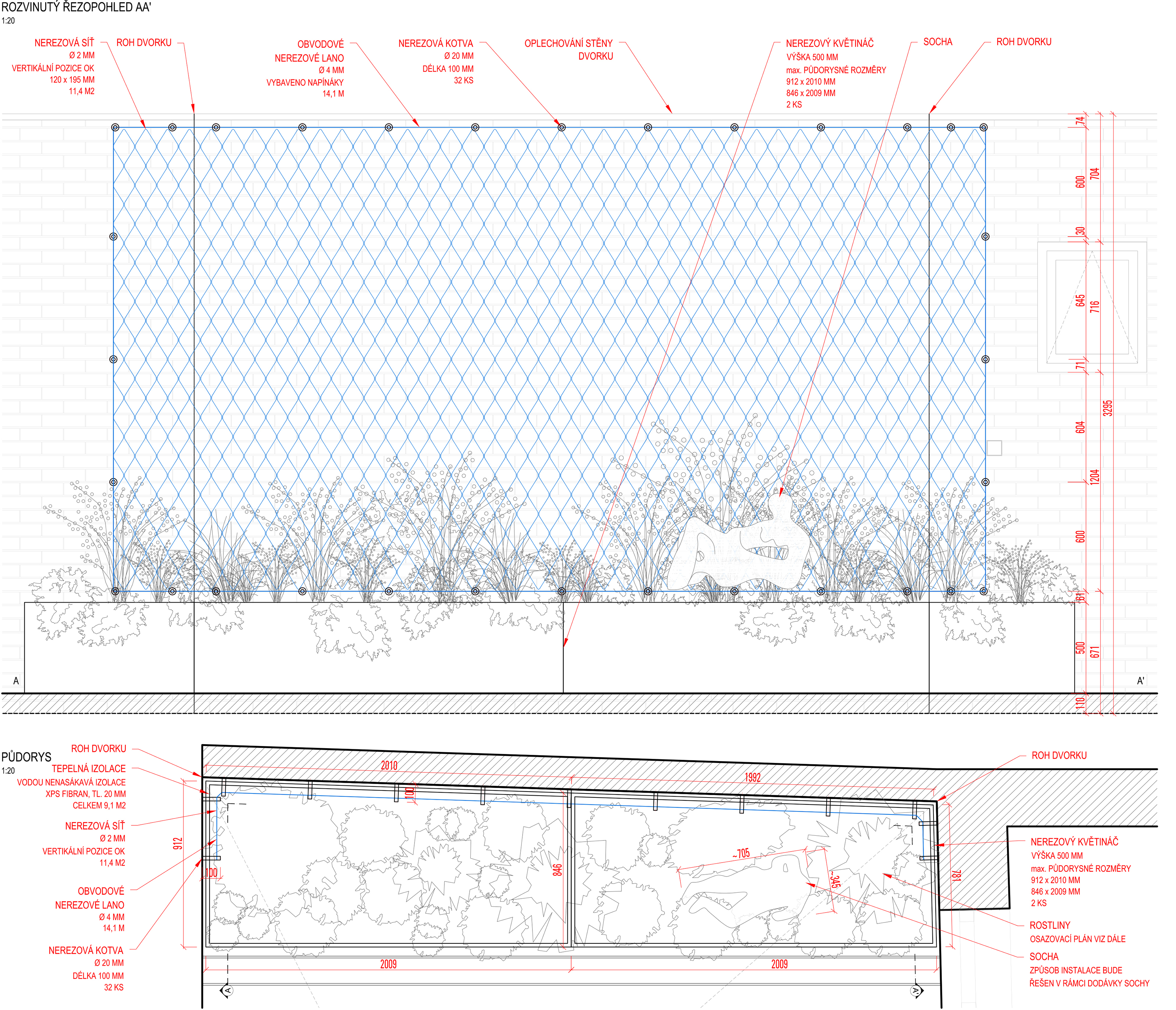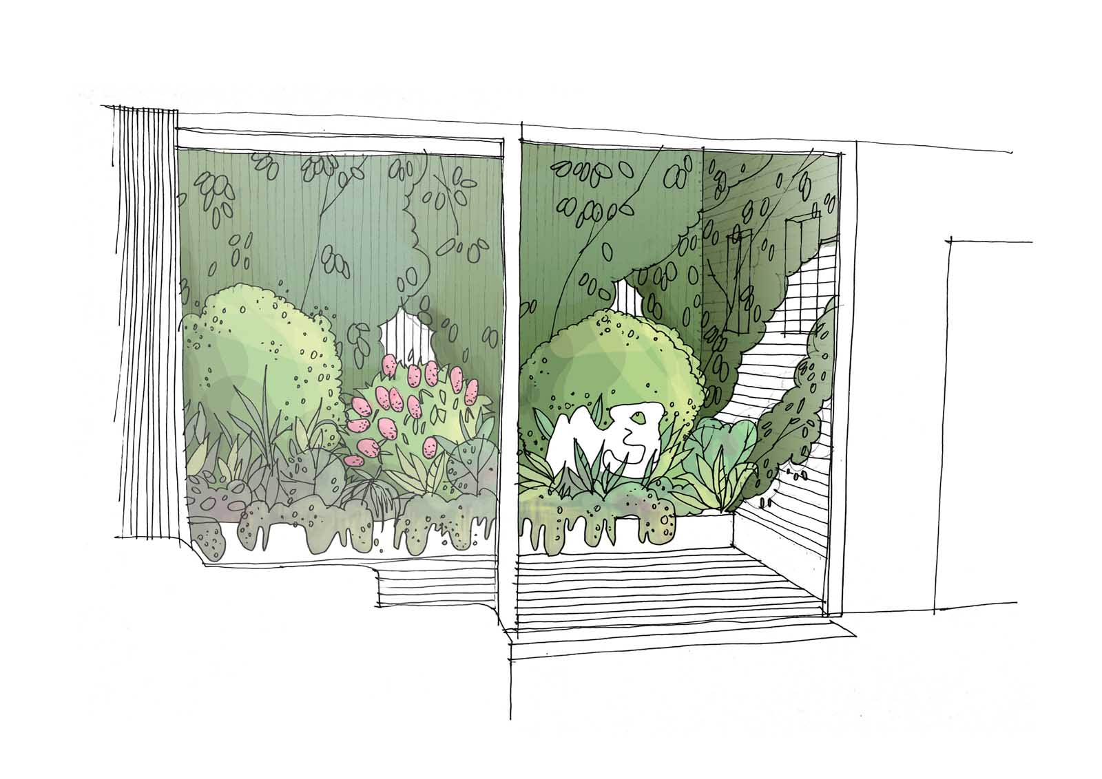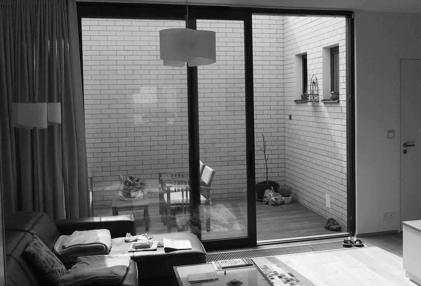 Stavebník si přál ozelenit dvorek, který navazuje přímo na obývací pokoj rodinného domku. Návrh jsme pojali koncepčně jako zelený obraz, na který se díváme z obýváku, a který se proměňuje v souladu s ročními cykly. Kombinaci trvalek, popínavých dřevin, cibulovin a letniček jsme vysadili do dvou na míru vyrobených nerezových květináčů. Do zdí dvorku je ukotvena nerezová síť sloužící jako opora pro vybrané ovíjivé rostliny.